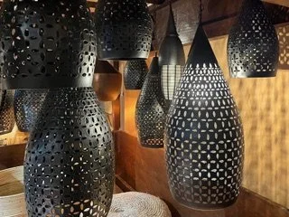 Hanging pendant lights have dark matte hand-hammered copper finish with cut-out patterning. Chain and ceiling cap provided.