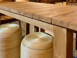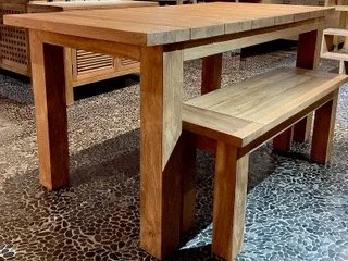 One and one-half inch thick horizontal planks are a design feature that also facilitates outdoor use. Planks, base and legs are Reclaimed Teak.